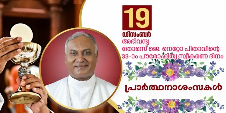 തോമസ് ജെ. നേറ്റോ പിതാവ് വൈദികനായി അഭിഷിക്തനായതിന്റെ വാർഷകമാണ് ഡിസംബർ പത്തൊൻപതിന്. 33 വർഷത്തിനു മുൻപുള്ള പൗരോഹിത്യ സ്വീകരണത്തിന്റെ ഓർമ്മകളുമായി മറ്റൊരു പൗരോഹിത്യസ്വീകരണ വാർഷികത്തിൽ പിതാവെത്തിയത് മണ്ണടിക്കോണത്തെ കരുണാലയം കേന്ദ്രത്തിൽ.