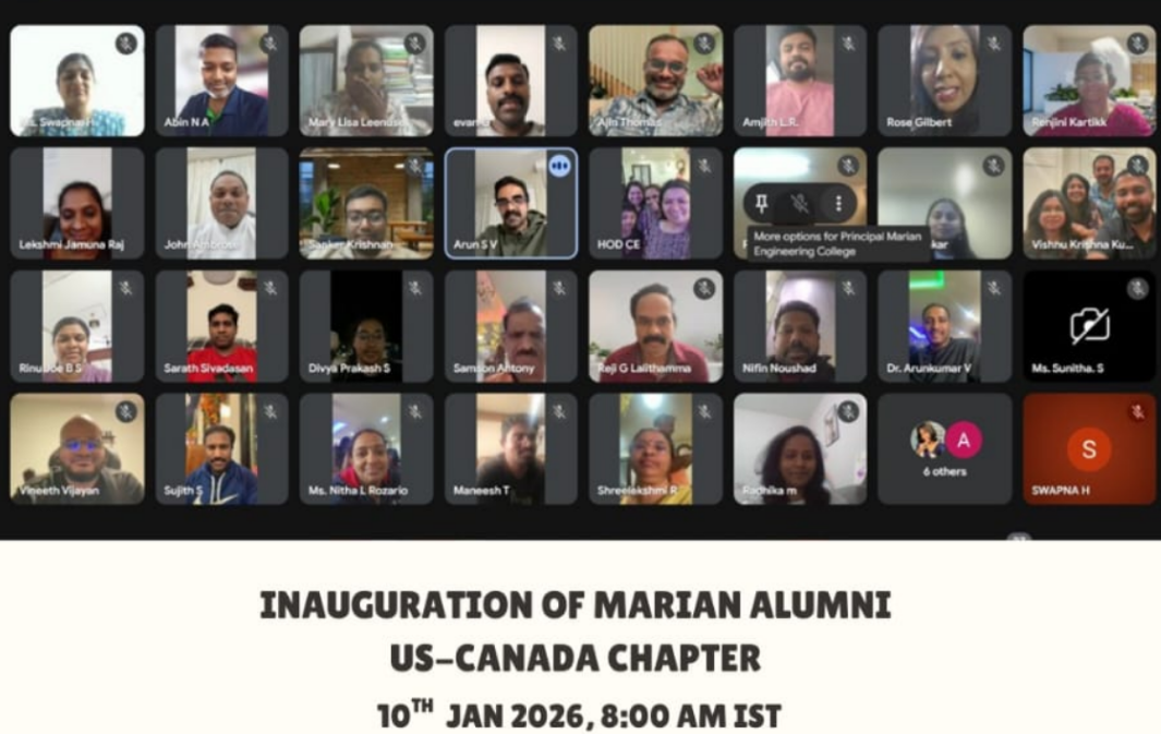 കഴക്കൂട്ടം: മരിയൻ എഞ്ചിനീയറിംഗ് കോളേജിന്റെ സിൽവർ ജൂബിലി ആഘോഷങ്ങളുടെ ഭാഗമായി യൂറോപ്യൻ ചാപ്റ്റർ, യു.എസ്–കാനഡ ചാപ്റ്റർ, മിഡിൽ ഈസ്റ്റ് ചാപ്റ്റർ എന്നീ മൂന്ന് മരിയൻ അലുമ്നി ഗ്ലോബൽ ചാപ്റ്ററുകളുടെ ഉദ്ഘാടനം 2026 ജനുവരി 9, 10 തീയതികളിൽ ഓൺലൈൻ സെഷനുകളിലൂടെ വിജയകരമായി നടന്നു. ഗൂഗിൾ മീറ്റ് വഴി സംഘടിപ്പിച്ച ഈ ഉദ്ഘാടന ചടങ്ങുകളിൽ മാനേജർ റവ. ഡോ. എ. ആർ. ജോൺ, പ്രിൻസിപ്പൽ ഡോ. അബ്ദുൽ നിസാർ എം, ഡീൻ ഡോ. സാംസൺ എ, ഫാ. ജിം കാർവിൻ, ഫാ. അബിൻ സ്റ്റാൻലി എന്നിവർ, വിവിധ വകുപ്പുമേധാവികൾ, അധ്യാപകസമൂഹം, അലുമ്നി എക്സിക്യൂട്ടീവ് അംഗങ്ങൾ, ലോകത്തിന്റെ വിവിധ ഭാഗങ്ങളിലുള്ള അലുമ്നികൾ എന്നിവർ പങ്കെടുത്തു.