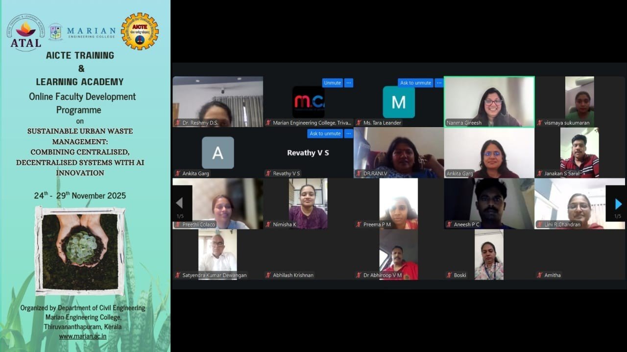 കഴക്കൂട്ടം: മരിയൻ എഞ്ചിനീയറിംഗ് കോളേജ് AICTE-യുടെ ധനസഹായത്തോടെ ദേശീയതലത്തിൽ ഓൺലൈൻ വർക്ക്ഷോപ്പ് നടന്നു. “സുസ്ഥിര നഗര മാലിന്യ മാനേജ്മെന്റ്: കേന്ദ്രികൃതവും വികേന്ദ്രികൃതവും ആയ സംവിധാനങ്ങളെ AI നവീകരണങ്ങളുമായി സംയോജിപ്പിക്കൽ” എന്നതായിരുന്ന് ആറ് ദിവസം നീണ്ടുനിന്ന വർക്ക്ഷോപ്പിന്റെ വിഷയം. രാജ്യത്തിന്റെ വിവിധ ഭാഗങ്ങളിൽ നിന്നായി ഏകദേശം 220 പ്രതിനിധികൾ പരിപാടിയിൽ പങ്കെടുത്തു. ഇന്ത്യയിലും വിദേശത്തുമുള്ള വിദഗ്ധർ കൈകാര്യം ചെയ്ത 11 സാങ്കേതിക സെഷനുകൾ ഈ വർക്ക്ഷോപ്പിന്റെ ഭാഗമായി സംഘടിപ്പിച്ചു.