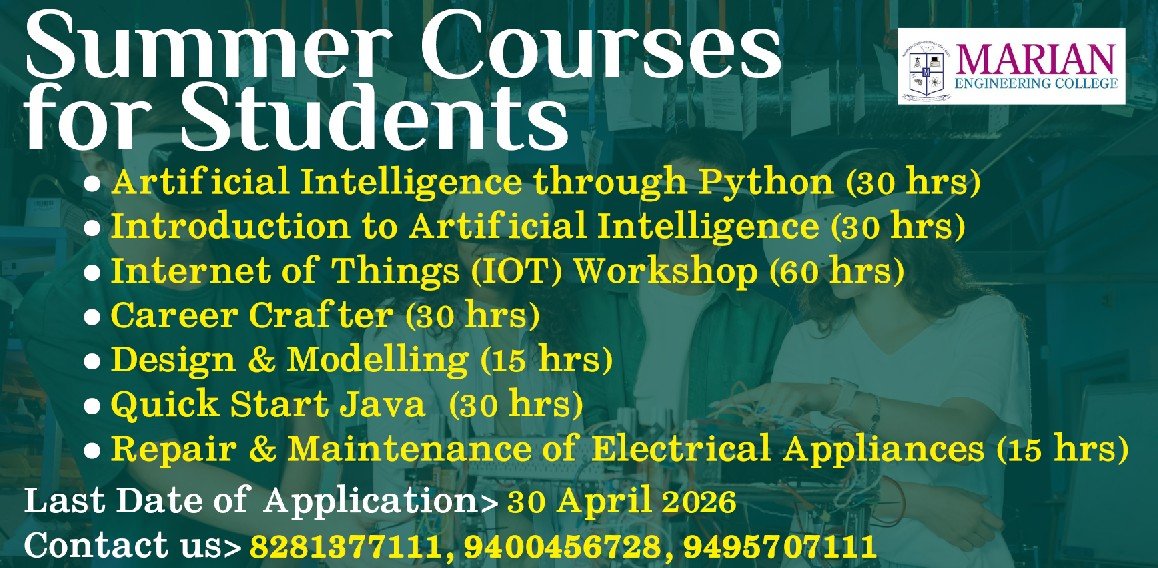 മരിയൻ എഞ്ചിനീയറിംഗ് കോളേജിൽ വിദ്യാർത്ഥികൾക്കായി അവധിക്കാല കോഴ്സുകളിലേക്ക് അപേക്ഷ ക്ഷണിക്കുന്നു