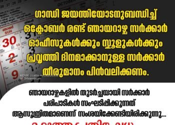 ഗാന്ധി ജയന്തിയോടനുബന്ധിച്ച് ഒക്ടോബർ രണ്ട് ഞായറാഴ്ച പ്രവൃത്തി ദിനമാക്കാനുള്ള സർക്കാർ തീരുമാനം പിൻവലിക്കണമെന്ന് കത്തോലിക്ക കോൺഗ്രസ് ഗ്ലോബൽ സമിതി.ഞായറാഴ്ച പ്രവൃത്തി ദിനമാക്കാനുള്ള തീരുമാനത്തിനെതിരെ വ്യാപക പ്രതിഷേധവുമായി മുന്നോട്ട്...