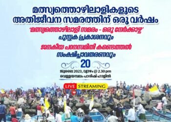 മത്സ്യത്തൊഴിലാളികളുടെ അതിജീവന സമരത്തിന് ഒരു വർഷം പൂർത്തിയാകുന്ന ജൂലൈ 20 ന് 'വിഴിഞ്ഞം മത്സ്യത്തൊഴിലാളിസമരം ഒരു നേർക്കാഴ്ച' എന്ന പുസ്തകത്തിന്റെ പ്രകാശനവും, ജനകീയ പഠനസമിതിയുടെ കണ്ടെത്തലുകളുടെ സംക്ഷിപ്താവതരണവും...