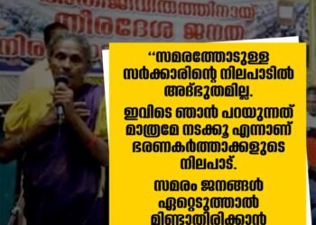 Read moreDetailsമത്സ്യത്തൊഴിലാളികളുടെ അവകാശ സമരം 80 ദിവസം പിന്നിടുമ്പോഴും സമരം ന്യായമാണെന്ന് സമ്മതിക്കുന്ന അധികാരികൾ അനുകൂലമായ നടപടികൾ ഇതുവരെയും സ്വീകരിച്ചിട്ടില്ല. ഈ പശ്ചാത്തലത്തിൽ വനിതാ സംഘടനകളെയും പാരിസ്ഥിതിക സംഘടനകളെയും...