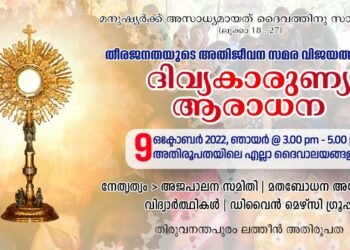 Read moreDetailsതിരുവനന്തപുരം അതിരൂപതയലെ ഇടവകകളിൽ തീര ജനതയുടെ അതിജീവന സമരവിജയത്തിനായി വരുന്ന ഞായറാഴ്ച ദിവ്യകാരുണ്യ ആരാധനന നടക്കും . ഒക്ടോബർ 9 ഞായറാഴ്ച അതിരൂപതയിലെ എല്ലാ ദേവാലയങ്ങളിലും ഉച്ചതിരിഞ്ഞ്...