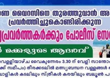 തിരുവനന്തപുരം : കൊറോണ വൈറസിനെ തുരത്തുവാൻ അക്ഷീണം പ്രവർത്തിച്ചുകൊണ്ടിരിക്കുന്ന ആരോഗ്യ പ്രവർത്തകർക്കും പോലീസ് സേനയ്ക്കും കടലിൻറെ മക്കളുടെ ആദരവ്. 2020 മെയ് 8 വെള്ളിയാഴ്ച വൈകുന്നേരം 3.30...