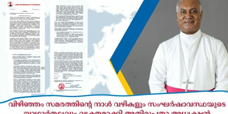 വിഴിഞ്ഞം സമരവുമായി ബന്ധപ്പെട്ട് അടുത്ത ദിവസങ്ങളിലുണ്ടായ ചില സംഭവങ്ങളുടെ പശ്ചാത്തലത്തിൽ, സമരത്തിന്റെ നാൾവഴികളും സംഘർഷത്തിന്റെ യാഥാർത്ഥ്യങ്ങളും സർക്കുലറിലൂടെ പങ്കുവെച്ച് അതിരൂപതാ അധ്യക്ഷൻ ഡോ.തോമസ് ജെ നെറ്റോ. സമരവുമായി ബന്ധപ്പെട്ട അതിരൂപത അധ്യക്ഷൻ പുറത്തിറക്കിയ സർക്കുലർ നാളെ ഞായറാഴ്ച ദിവ്യബലി മധ്യേ വായിക്കും.