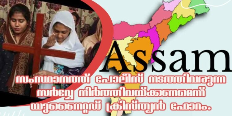 അസം സംസ്ഥാനത്ത് പോലീസ് നടത്തിവരുന്ന രഹസ്യ സർവ്വേ നിർത്തലാക്കണമെന്ന് ഇന്ത്യയിലെ ക്രൈസ്തവർ. സംസ്ഥാനത്ത് ദേവാലയങ്ങളിലും മറ്റ് പ്രാർത്ഥന ആലയങ്ങളിലും ക്രിസ്ത്യൻ സ്ഥാപനങ്ങളിലും ഒത്തുകൂടുന്നവരുടെ വിവരങ്ങൾ പോലീസ് രഹസ്യമായി ശേഖരിക്കുന്നത് ഉടനടി നിർത്തലാക്കണമെന്ന് യുണൈറ്റഡ് ക്രിസ്ത്യൻ ഫോറം ആവശ്യപ്പെട്ടു.