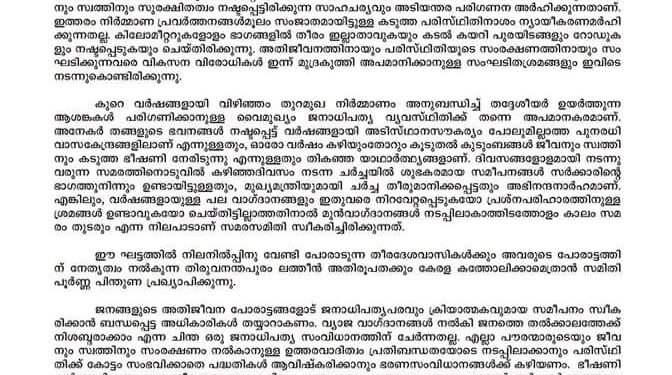തുറമുഖ വികസനത്തിന്റെ പേരിൽ കടുത്ത മനുഷ്യാവകാശ ലംഘനം നേരിട്ടുകൊണ്ടിരിക്കുന്ന അവകാശ സമരത്തിന് പിന്തുണ അറിയിച്ച് കെസിബിസി(കേരള കാത്തലിക് ബിഷപ്പ്സ് കൗൺസിൽ). തുറമുഖ വികസനത്തിന്റെ ഭാഗമായ നിർമ്മാണങ്ങളെ തുടർന്നുണ്ടാകുന്ന പാരിസ്ഥിതിക പ്രശ്നങ്ങളെയും അതേത്തുടർന്ന് ദുരിതമനുഭവിക്കുന്ന പതിനായിരക്കണക്കിന് തീരദേശ ജനതയുടെ പ്രശ്നങ്ങളെയും പരിഹരിക്കാനുള്ള നടപടികൾ ഉടനടി സ്വീകരിക്കണമെന്ന് കെസിബിസി ആവശ്യപ്പെട്ടു. ദിവസങ്ങളോളമായി നടന്നുവരുന്ന സമരത്തെ വേണ്ടവിധത്തിൽ ഭരണാധികാരികൾ പരിഗണിച്ചിട്ടില്ല എന്നതിന് ഉദാഹരണമാണ് കഴിഞ്ഞദിവസം നടന്ന ചർച്ചയെ തുടർന്നുണ്ടായ സമരസമിതിയുടെ പ്രഖ്യാപനം. സമരത്തിൽ ഉന്നയിക്കുന്ന ആവശ്യങ്ങൾ നടപ്പിലാക്കാമെന്നോ പരിഗണിക്കാമെന്നോ ചർച്ചയിൽ വാക്കുകൊണ്ട് പറഞ്ഞതല്ലാതെ രേഖാമൂലം യാതൊരുവിധ പ്രഖ്യാപനവും സർക്കാരിന്റെ ഭാഗത്തുനിന്നും ഉണ്ടായിട്ടില്ല. തുറമുഖ നിർമ്മാണത്തെ തുടർന്ന് തീരത്തു നിന്നും കുടിയൊഴിപ്പിക്കപ്പെടുന്ന തീരദേശ ജനതയുടെ അവകാശങ്ങൾക്കെതിരെ മുഖം തിരിക്കുന്ന സർക്കാർ എത്രയും വേഗം ആ ജനതയുടെ ആവശ്യങ്ങൾ നീതിയുക്തമായി നടപ്പിലാക്കണമെന്ന് കെസിബിസി പത്രക്കുറിപ്പിൽ പറഞ്ഞു.