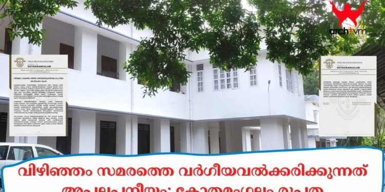 തീരപ്രദേശത്തെ പാവപ്പെട്ട മത്സ്യത്തൊഴിലാളികളോടൊപ്പം നിന്ന് അവർക്ക് നേതൃത്വം കൊടുക്കുന്ന തിരുവനന്തപുരം ലത്തീൻ അതിരൂപത ആർച്ച് ബിഷപ്പിനും സഹായ മെത്രാനുമെതിരെ അകാരണമായി കേസുകൾ ചാർജ് ചെയ്തിരിക്കുന്നത് ന്യായീകരിക്കാൻ ആവുന്നതല്ല. പാവങ്ങളുടെ സർക്കാർ എന്ന് അവകാശപ്പെടുകയും കുത്തക മുതലാളിമാരുടെ താൽപര്യങ്ങൾ സംരക്ഷിക്കാൻ ഏതറ്റം വരെയും പോകുന്ന രീതിയാണ് കേരളത്തിലെ സർക്കാർ ഇപ്പോൾ പിന്തുടരുന്നത്. നിലനിൽപ്പിനു വേണ്ടിയുള്ള സമരത്തെ തീവ്രവാദ പ്രവർത്തനമായും വർഗീയ സംഘർഷമായും അവതരിപ്പിക്കുന്ന ശൈലി അപകടകരമാണ്. അക്രമവും അപക്വവുമായ പ്രതികരണങ്ങളും ആരുടെ ഭാഗത്തു നിന്നായാലും ന്യായീകരിക്കാനാവില്ല. കേരളത്തിന്റെ മുഖ്യമന്ത്രി പ്രളയ സമയത്ത് രക്ഷാ സൈന്യം എന്ന് വിശേഷിപ്പിച്ച മത്സ്യത്തൊഴിലാളികളെ ഇപ്പോൾ തീവ്രവാദികൾ, വികസന വിരോധികൾ എന്ന രീതിയിൽ പൊതുസമൂഹത്തിൽ ആക്ഷേപിച്ച പ്രസ്താവനകളിറക്കുന്നത് സർക്കാരിന്റെയും രാഷ്ട്രീയപാർട്ടികളുടെയും അവസരവാദത്തിന്റെയും ഇരട്ടത്താപ്പിന്റെയും ഉദാഹരണങ്ങളാണ്. വിഴിഞ്ഞത്തെ തീരദേശ ജനതയുടെ പ്രശ്നങ്ങൾ പരിഹരിക്കാൻ സംസ്ഥാന സർക്കാർ ദുരഭിമാനം വെടിഞ്ഞ് മുൻകൈയെടുക്കണമെന്നും കോതമംഗലം രൂപത ആവശ്യപ്പെട്ടു.