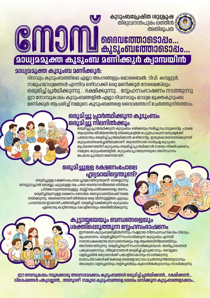 വെള്ളയമ്പലം: സന്തുഷ്ട കുടുംബങ്ങളെ രൂപപ്പെടുത്തുന്നതിന്റെ ഭാഗമായി 2026 നോമ്പുകാലത്ത് കുടുംബങ്ങളിൽ മാധ്യമമുക്ത മണിക്കൂർ പാലിക്കാൻ പ്രേരിപ്പിക്കുന്ന ക്യാമ്പയിൻ കുടുംബപ്രേഷിത ശുശ്രൂഷ അരംഭിച്ചു. ഇതിന്റെ ഭാഗമായി ഫെബ്രുവരി 14 ശനിയാഴ്ച വെള്ളയമ്പലം ആനിമേഷൻ സെന്ററിൽ നടന്ന ഗ്രാറ്റിറ്റ്യൂഡ് ദിനാചരന ചടങ്ങിൽ ബിഷപ് ക്രിസ്തുദാസ് മാധ്യമമുക്ത കുടുംബമണിക്കൂർ ലഖുലേഖ പ്രകാശനം ചെയ്തു. കുടുംബങ്ങളിൽ മാധ്യമ മുക്ത മണിക്കൂർ പാലിക്കേണ്ട വിധവും അതിന്റെ മേന്മകളും വിശദീകരിക്കുന്നതാണ് ലഖുലേഖ. ഇത് വരുംദിനങ്ങളിൽ അതിരൂപതയിലെ എല്ലാം കുടുംബങ്ങളിലും കുടുംബ ശുശ്രൂഷ പ്രവർത്തകർ വിതരണം ചെയ്യുകയും മാധ്യമ മുക്ത കുടുംബ മണിക്കൂർ പാലിക്കുവാൻ പ്രേരിപ്പിക്കുകയും ചെയ്യും. ഇതുകൂടാതെ ക്യാമ്പയിന്റെ ഭാഗമായി അതിരൂപത മീഡിയ കമ്മിഷനും കുടുംബ ശുശ്രൂഷയും സംയുക്തമായി നോമ്പുദിവസങ്ങളിൽ പ്രാർഥനാ നിയോഗമടങ്ങിയ ഫ്ലയേഴ്സ് ദിവസവും പ്രചരിപ്പിക്കും.