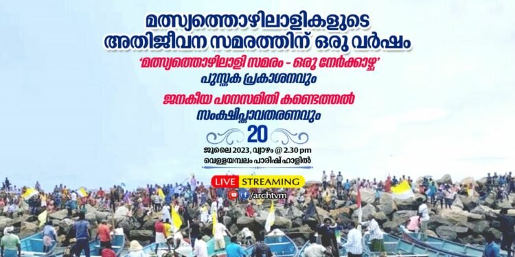 മത്സ്യത്തൊഴിലാളികളുടെ അതിജീവന സമരത്തിന് ഒരു വർഷം പൂർത്തിയാകുന്ന ജൂലൈ 20 ന് ‘വിഴിഞ്ഞം മത്സ്യത്തൊഴിലാളിസമരം ഒരു നേർക്കാഴ്ച’ എന്ന പുസ്തകത്തിന്റെ പ്രകാശനവും, ജനകീയ പഠനസമിതിയുടെ കണ്ടെത്തലുകളുടെ സംക്ഷിപ്താവതരണവും വെള്ളയമ്പലം ലിറ്റിൽ ഫ്ളവർ കമ്മ്യൂണിറ്റി ഹാളിൽ വച്ച് നടക്കും. തിരുവനന്തപുരം അതിരൂപതാ മെത്രാൻ ഡോ. തോമസ് ജെ. നെറ്റോ- യുടെ അദ്ധ്യക്ഷതയിൽ ചേരുന്ന സമ്മേളനം ഫ്രീലാൻസ് മാധ്യമ- പരിസ്ഥിതി പ്രവർത്തകൻ ശ്രീ. ശ്രീധർ രാധാകൃഷ്ണൻ ഉത്ഘാടനം ചെയ്യും.