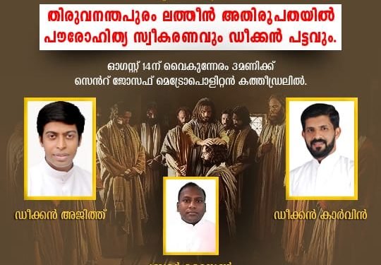 തിരുവനന്തപുരം: തിരുവനന്തപുരം ലത്തീൻ അതിരൂപതയിൽ ഓഗസ്റ്റ് 14ന് വൈകുന്നേരം 3മണിക്ക് സെൻറ് ജോസഫ് മെട്രോപൊളിറ്റൻ കത്തീഡ്രലിൽ ആർച്ച് ബിഷപ്പ് സൂസപാക്യം അധ്യക്ഷത വഹിക്കുന്ന ദിവ്യബലിയിൽ ഡീക്കൻ അജിത്ത്, ഡീക്കൻ കാർവിൻ എന്നിവർ പൗരോഹിത്യവും ബ്രദർ ടൈസൺ ഡീക്കൻ പട്ടവും സ്വീകരിക്കും.ഡീക്കൻ ജിം കാർവിൻ റോച്ച് വള്ളവിള സെൻറ് മേരീസ് ദൈവാലയ ഇടവക അംഗം ആണ്. 1988 ഒക്ടോബർ 4 ന് മരിയ സേവിയർ ബെല്ലാമ്മ ദമ്പതികളുടെ മൂന്നാമത്തെ മകനായി ജനിച്ചു. പോലീസ് ഉദ്യോഗസ്ഥനായ പിതാവും അദ്ധ്യാപകയായ മാതാവും ദൈവം തങ്ങൾക്കു സമ്മാനിച്ച മക്കളെ ചിട്ടയോടും ദൈവഭക്തിയോടയും കൂടെയാണ് വളർത്തിയത്. നീരോടിത്തുറയിലെ സെൻറ് നിക്കോളാസ് മിഡിൽ സ്കൂളിൽ അമ്മയുടെ കരം പിടിച്ചു എന്നും പോകുമ്പോൾ മറ്റ് കുട്ടികൾ ടീച്ചറായ അമ്മയെ സ്നേഹിക്കുന്നത് കണ്ട് ആദ്യം ഒരു അദ്ധ്യാപകൻ ആകണം എന്നായിരുന്നു കുഞ്ഞു കാർവിൻ്റെ ആഗ്രഹം. പിന്നീട് നാഗർകോവിൽ കാർമൽ ഹയർ സെക്കണ്ടറി സ്കൂൾ പഠനവും ബി.എസ്.സി ഫിസിക്സ് തിരുച്ചി സെന്റ് ജോസഫ്സ് കോളേജ് പഠനവും വ്യസ്തമായ ആഗ്രഹം യുവാവായ കാർവിനിൽ ജനിപ്പിച്ചു, അതായത് ഒരു വൈദീകൻ ആകണം. ജെസ്യൂട്ട് വൈദീകരുടെ വിദ്യാഭ്യാസ സ്ഥാപനങ്ങളിലുള്ള രൂപീകരണമാണ് പ്രധാനമായും ഒരു വൈദീകനാകാനുള്ള ഉറച്ച തീരുമാനം എടുക്കാൻ സഹായിച്ചതെന്ന് ഡീക്കൻ കാർവിൻ പറയുന്നു.