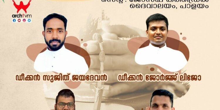 ഇന്ന് വൈകിട്ട് മൂന്ന് മണിക്ക് പാളയം സെന്റ് ജോസഫ്സ് കത്തീഡ്രൽ ദേവാലയത്തിൽ വച്ച് ക്രിസ്തുരാജപുരം, പാളയം, നീരോടി, മര്യനാട് ഇടവകകളിൽ നിന്നും നാലു പേർ പൗരോഹിത്യ, ഡീക്കൻ പട്ടങ്ങളിലേക്ക് അഭിഷേകം ചെയ്യപ്പെടും. അഭി. തോമസ് നെറ്റോ പിതാവ് മുഖ്യ കാർമ്മികനായിരിക്കും. ഡീ. സുജിത്തും, ഡീ. ജോർജ്ജ് ലിജോയുമാണ് വൈദികരായി അഭിഷേകം ചെയ്യപ്പെടുക. ബ്ര. ജോയി ആന്റണിയും, ബ്ര. വിൻസെന്റ് കുമാറുമാണ് നവഡീക്കന്മാരാവുക.