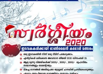 തിരുവനന്തപുരം അതിരൂപത മീഡിയ കമ്മീഷന്റെ ആഭിമുഖ്യത്തിൽ അതിരൂപതയിലെ ഇടവകകൾക്കായി ഓൺലൈൻ കരോൾ മത്സരം 'സ്വർഗ്ഗീയം 2020' സംഘടിപ്പിക്കുന്നു. ഇടവക വികാരിയുടെ അനുമതിയോടുകൂടി ഒരു ഇടവകയിൽ നിന്ന് ഒരു ...