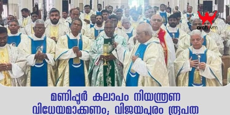 മണിപ്പൂർ കലാപം നിയന്ത്രണവിധേയമാക്കണമെന്ന ആവശ്യമുന്നയിച്ച് വിജയപുരം രൂപത. അൻപത് ദിവസങ്ങൾ പിന്നിടുന്ന മണിപ്പൂർ കലാപം നിയന്ത്രണ വിധേയമാക്കണമെന്ന് വിജയപുരം രൂപതാ വൈദിക സമിതി ആവശ്യപ്പെട്ടു. വംശീയഹത്യയിലും അക്രമസംഭവങ്ങളിലും ഉത്കണ്ഠ രേഖപ്പെടുത്തിയ വൈദിക സമിതി ജനങ്ങളുടെ സ്വത്തിനും ജീവനും സംരക്ഷണം നൽകുവാൻ പ്രധാന മന്ത്രിയും രാഷ്ട്രപതിയും ഒരുമിച്ച് ഇടപെടണമെന്നും ആവശ്യപ്പെട്ടു.