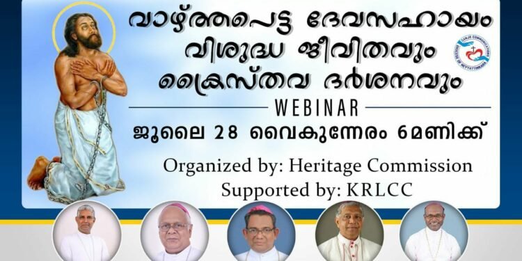 രക്തസാക്ഷിത്വം വരിച്ച വാഴ്ത്തപ്പെട്ട ദേവസഹായം പിള്ളയുടെ ജീവിതവും ക്രൈസ്തവ ദർശനവും ചർച്ചാവിഷയമാകുന്ന വെബീനർ ജൂലൈ 28 വൈകുന്നേരം ആറുമണിക്ക് നടക്കും. കെ.ആർ.എൽ.സി.സി ഹെറിറ്റേജ് കമ്മീഷനും കൊച്ചി, ആലപ്പുഴ, പുനലൂർ, കൊല്ലം, തിരുവനന്തപുരം, നെയ്യാറ്റിൻകര രൂപതകളിലെ ഹെറിറ്റേജ് കമ്മീഷനുകളും സംയുക്തമായാണ് വെബീനർ സംഘടിപ്പിക്കുന്നത് സൂം പ്ലാറ്റ്ഫോമിൽ നടക്കുന്ന പരിപാടിയുടെ പ്രോഗ്രാം കോഡിനേറ്റർ തിരുവനന്തപുരം അതിരൂപതാ ഹെറിറ്റേജ് കമ്മിഷൻ എക്സിക്യൂട്ടീവ് സെക്രട്ടറിയായ ഫാ. സിൽവസ്റ്റർ കുരിസ് ആണ്.